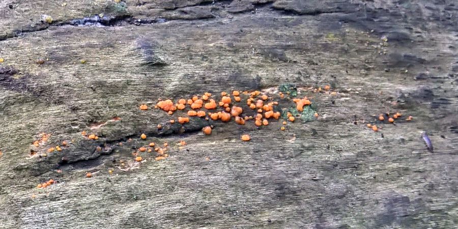 This might be: Dacrymyces stillatus. It's microscopic and only visible because of its color. One day it was there and the other day it was gone. I despaired of ever determining it, but it seems to be very common and it had a prominent place in my new mushroom book.